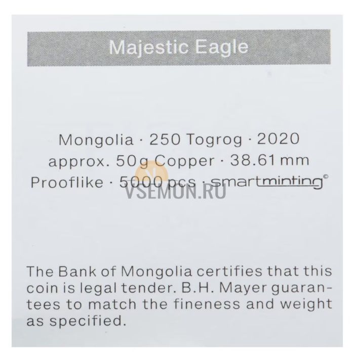 Название на русском Монголия 250 тугриков 2020 (Величественный орел)