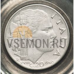 Италия 20 чентезимо 1940-1943 Либертина; король Виктор Эммануил III (XF)